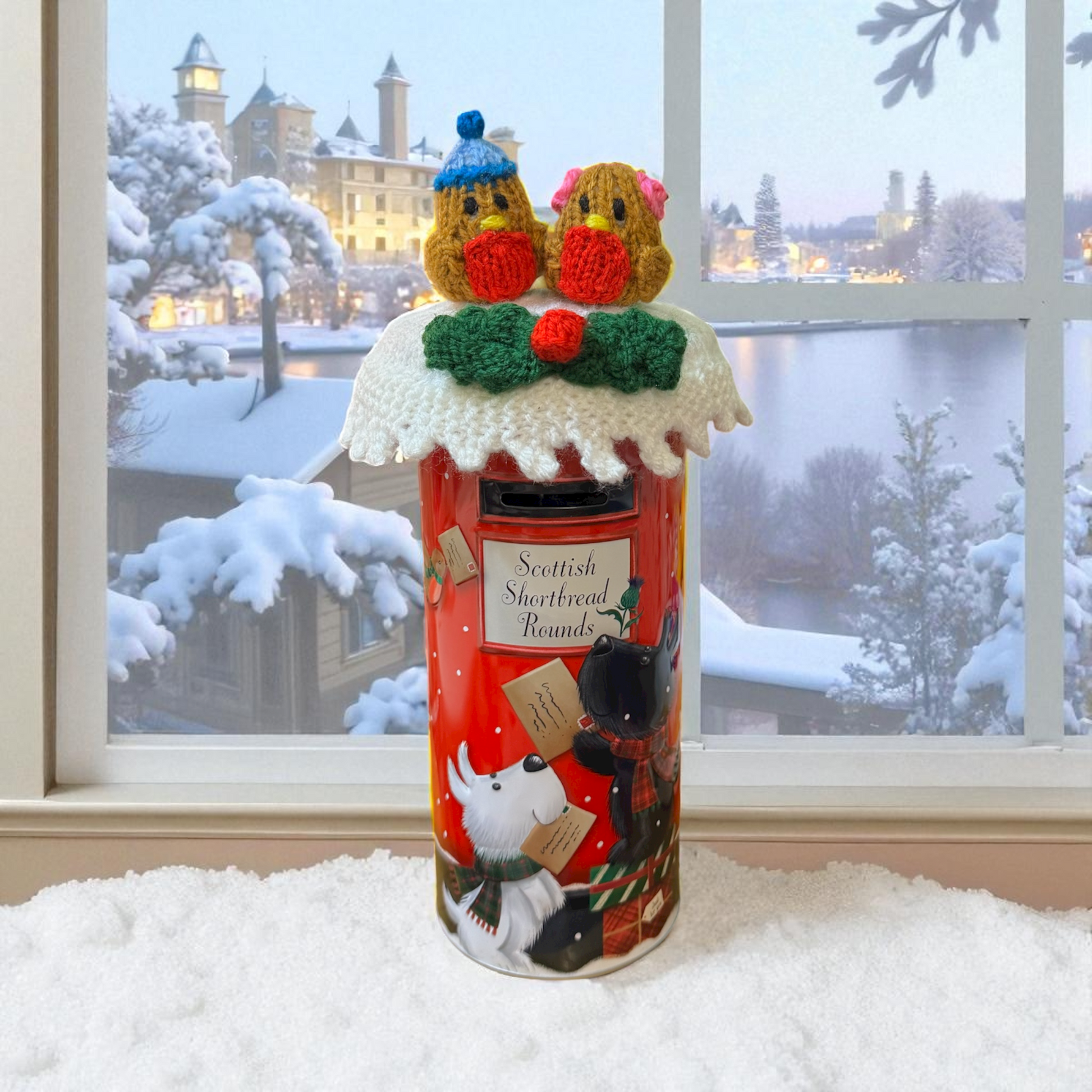 KNITTING PATTERN - Christmas Snowy Pillar Box Topper with Robins - covers 11 cm diameter biscuit tin