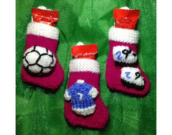 This knitting pattern is for three Christmas stocking tree decorations with a football, a football shirt and football boots.
