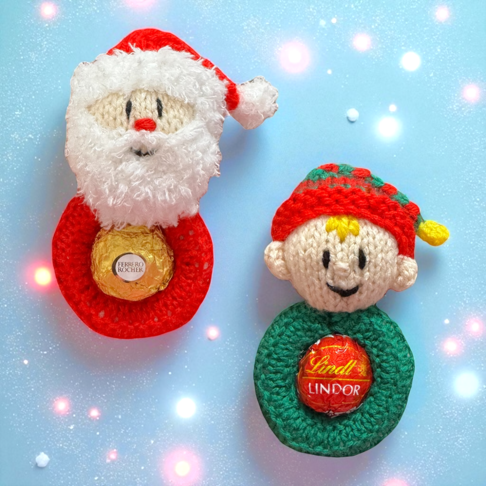 KNITTING PATTERN - Hanging Father Christmas Santa and Elf choc cover fits Fererro / Lindt